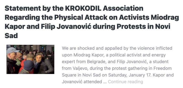 We are shocked and appalled by the violence inflicted upon Miodrag Kapor, a political activist and energy expert from Belgrade, and Filip Jovanović, a student from Valjevo, during the protest gathering in Freedom Square in Novi Sad on Saturday, January…