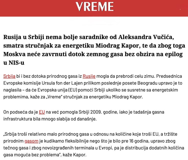 Articles, Media Coverage, NewsNov. 28, 2025. Potential Russian Countermeasures if Serbia Expropriates NIS | Vreme weeklymiokaporNovember 28, 2025